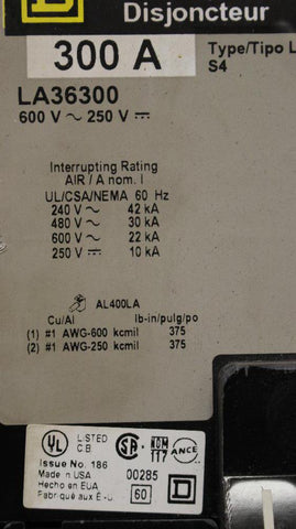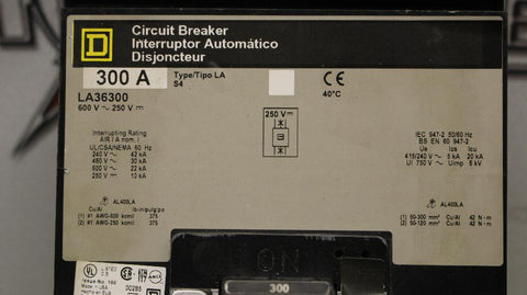 Description: Square D LA36300 Molded Case Circuit Breaker 300 Amp 600 Volt I Line