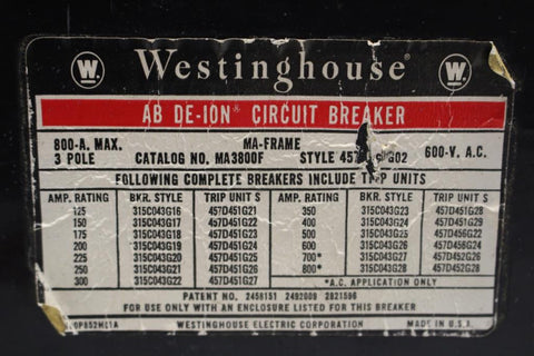 Westinghouse 800 Amp MA3800F Molded Case Circuit Breaker 600 Volt