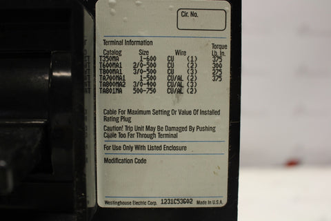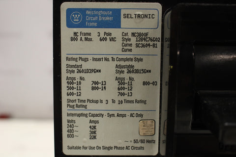 Westinghouse MC3800F Molded Case Circuit Breaker 800 Amp 600 Volt