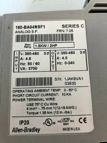 Description:ALLEN BRADLEY 16-BA04NSF1 3-Phase AC Smart Speed Controller 380 - 460 VAC 4 A