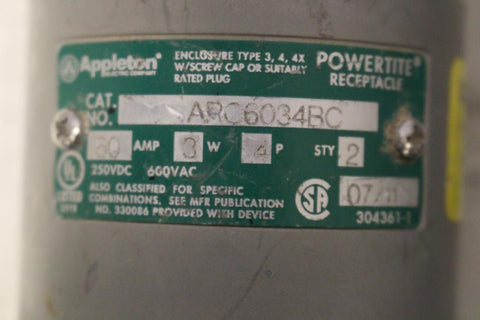 Description:APPLETON ARC6034BC 3W4P 60AMP 600VAC POWERTITE FEMALE CORD END