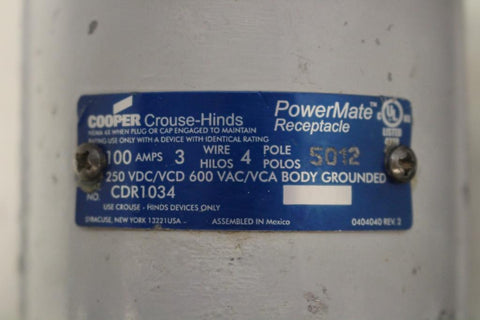 Description:CROUSE HINDS CDR1034 3W4P 600VAC 100AMP POWERMATE RECEPTACLE