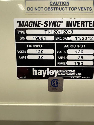 Description: Hayley Industrial TI-120/120-3 MAGNE-SYNC INVERTER 30 Amp 120 Volt DC Input 25 Amp 120 Volt AC Output