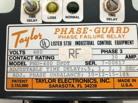 Description:TAYLOR PHASE GUARD PND-480 DPDT PHASE FAILURE RELAY