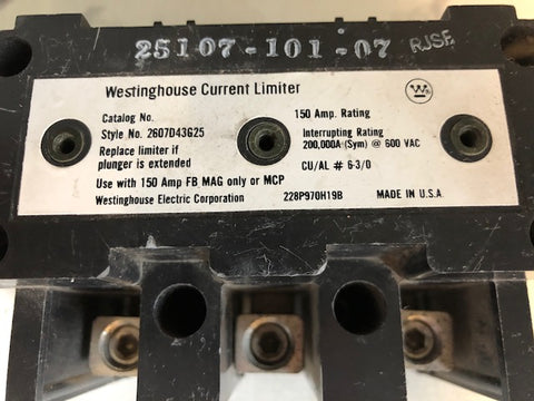 Description:WESTINGHOUSE 2607D43G25 CURRENT LIMITER 150AMP 600VAC FOR USE WITH FB OR MCP BREAKER